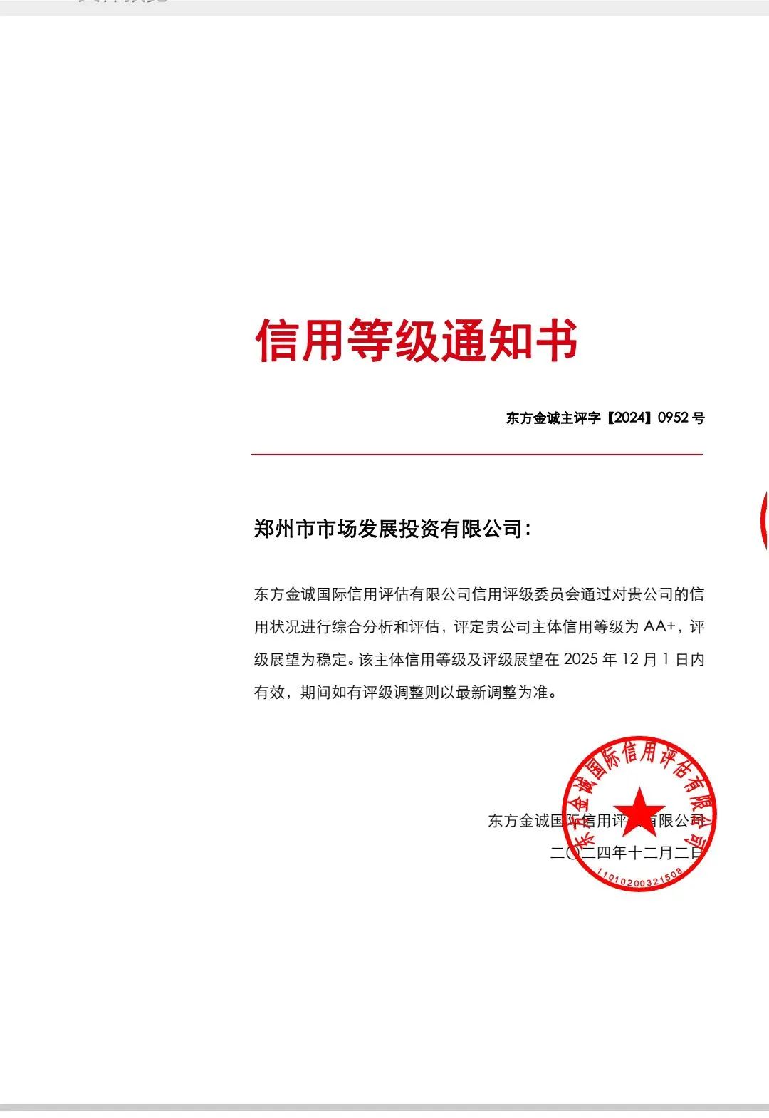 近日,鄭州市市場(chǎng)發(fā)展投資有限公司獲得國內權威評級機構東方金誠國際信用評估有限公司AA+主體信用評級,評級展望為“穩定”。